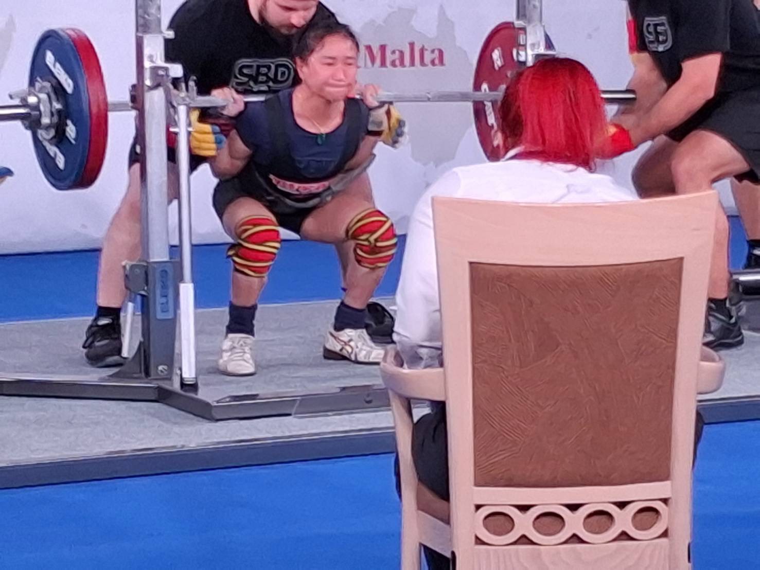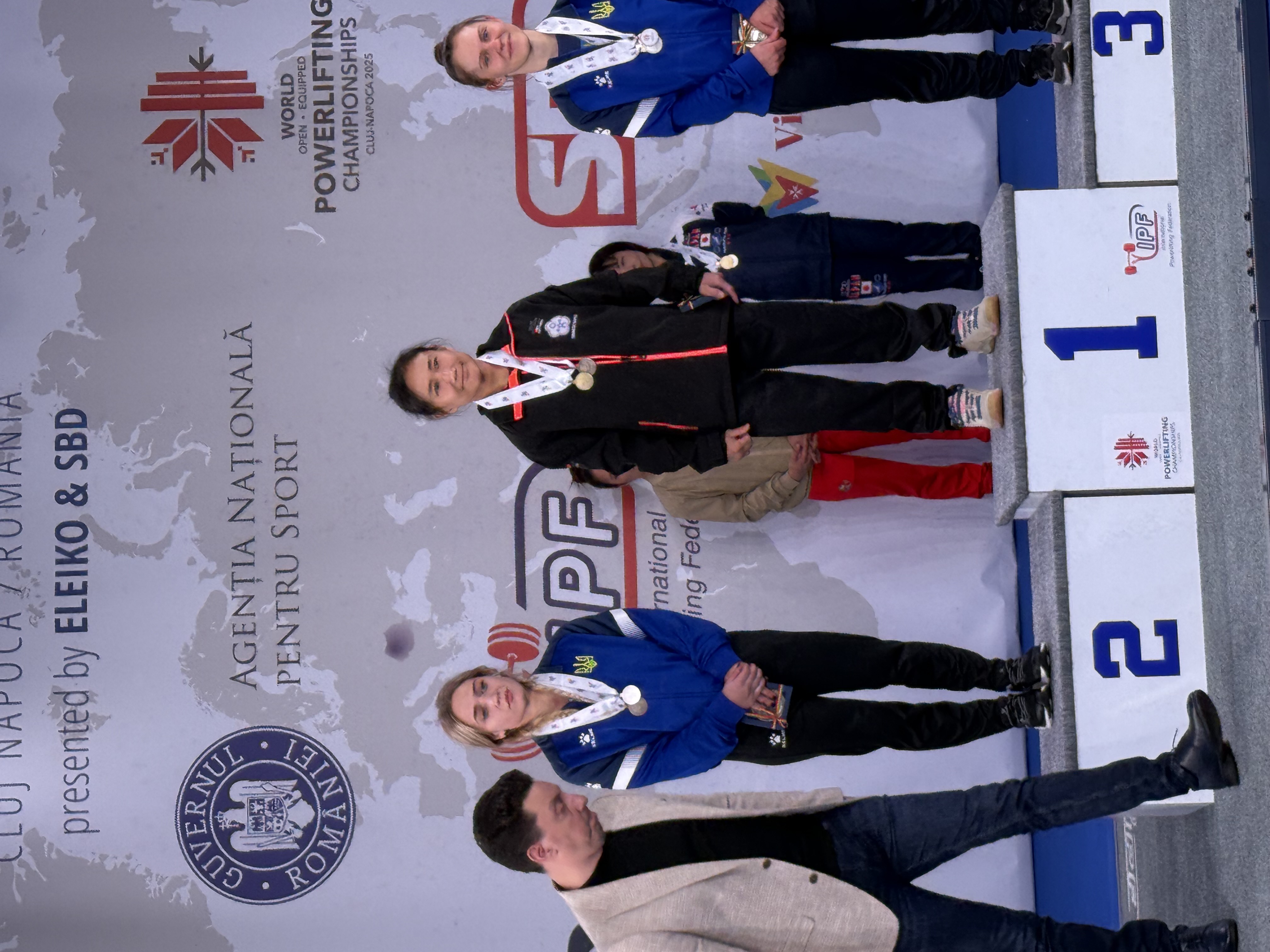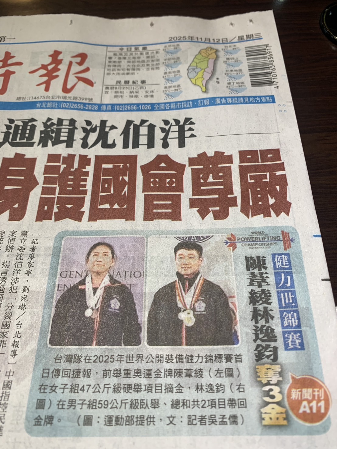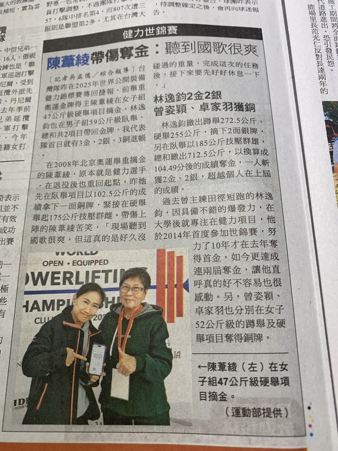 比賽地點:羅馬尼亞-克盧日納波卡 比賽日期:114/11/10-16 相關報導:yahoo!新聞、民視新聞網 (▲本校舉重隊陳葦綾副教授參加 2025年世界公開裝備健力錦標賽女子組47公斤級硬舉金牌頒獎照(左圖)、比賽照(右圖) | 謝謝陳師提供)